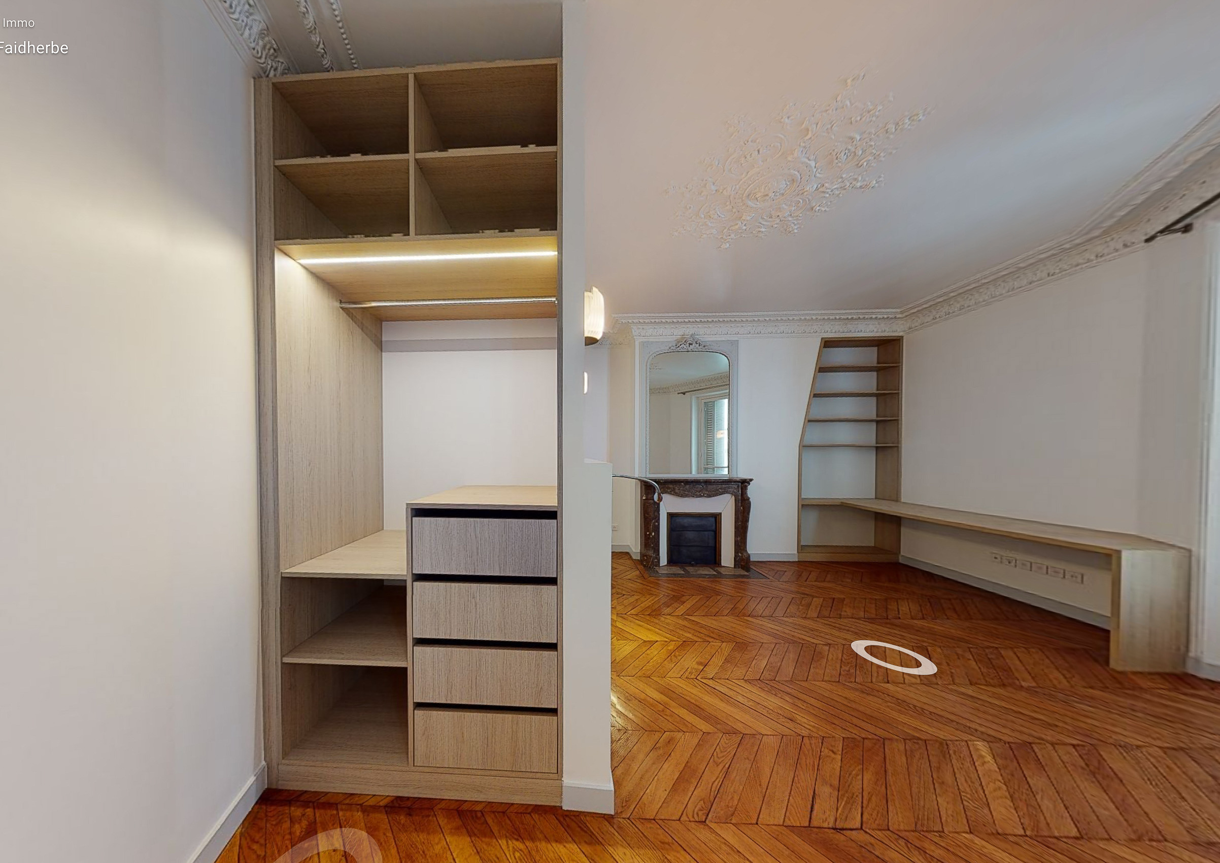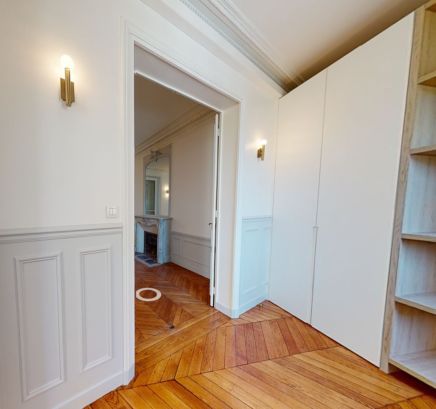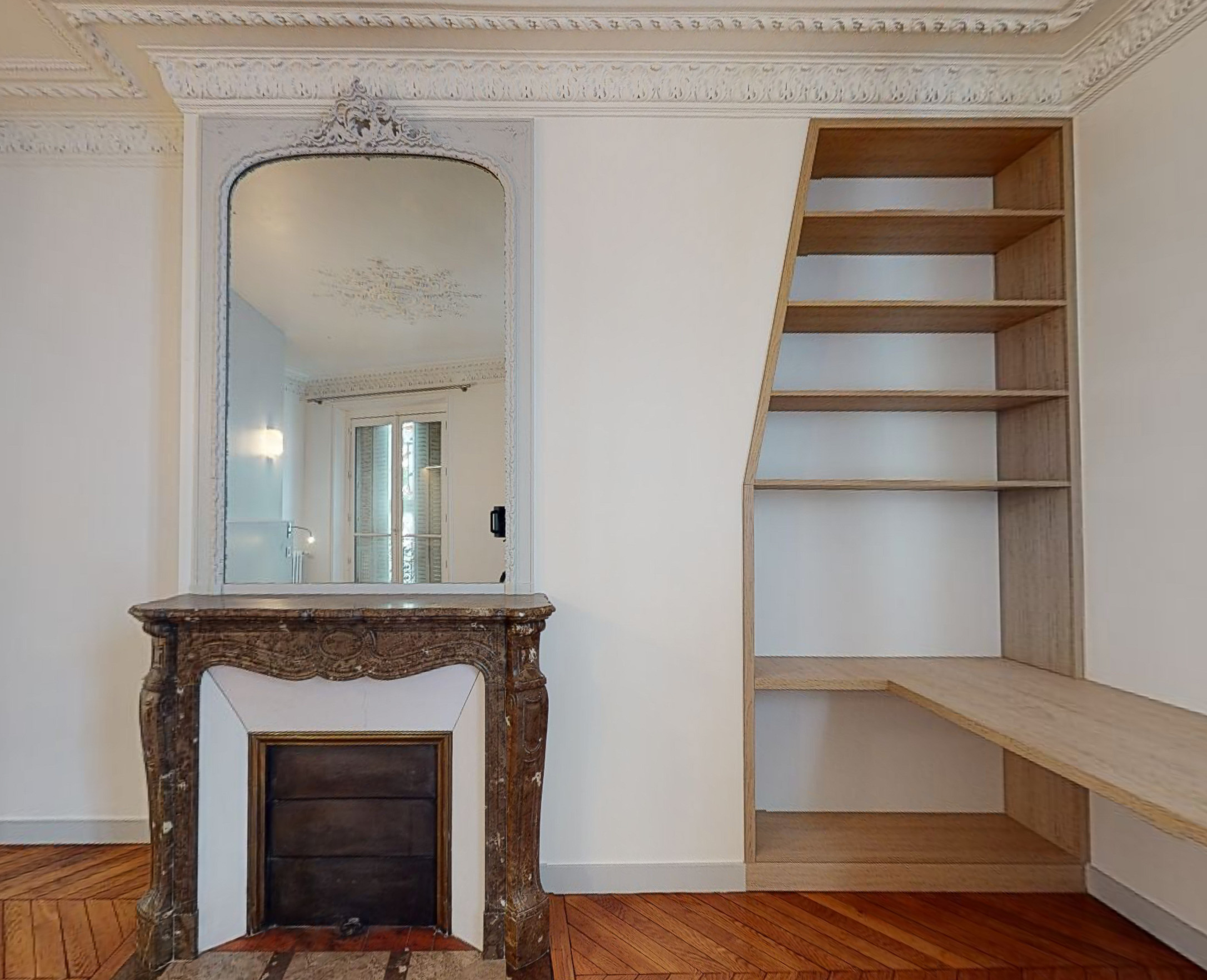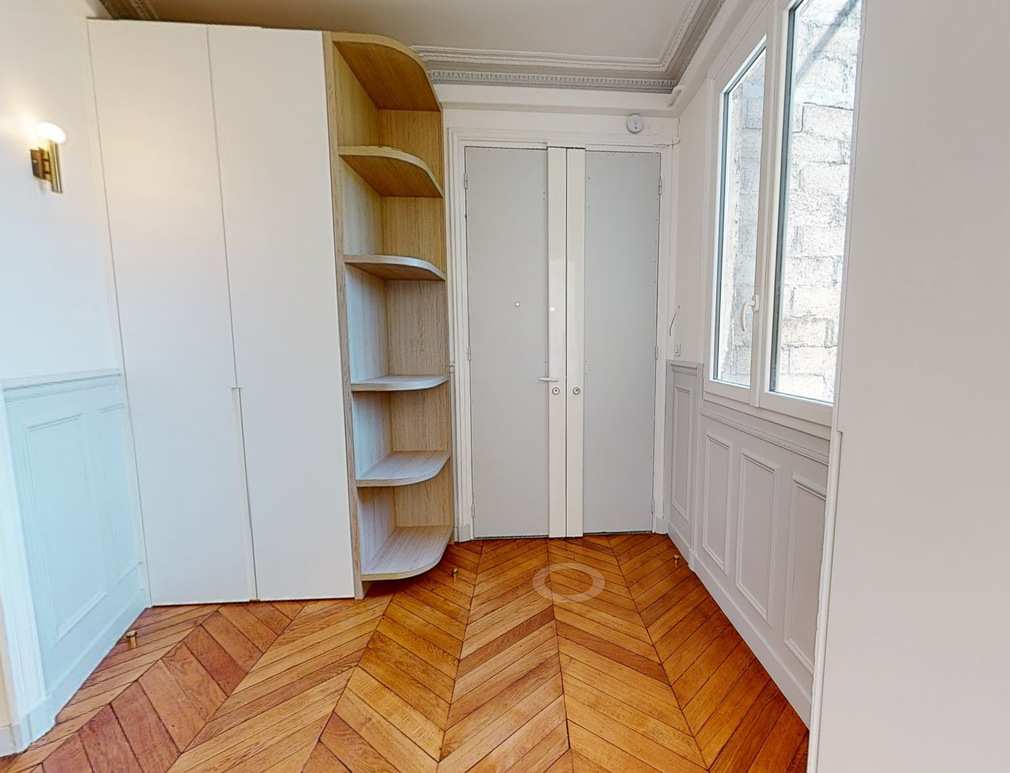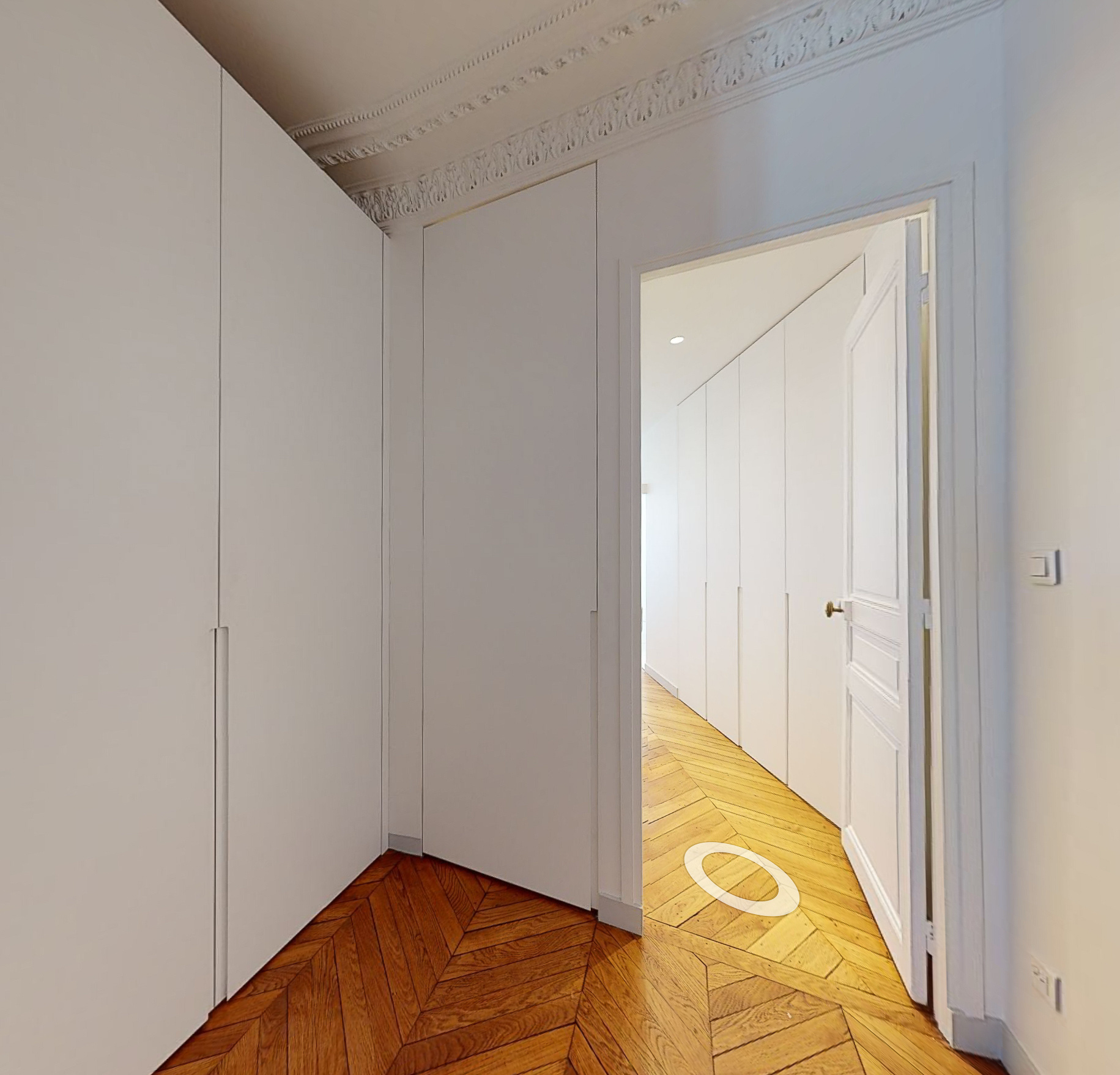 Création de rangement sur mesure. Coffrages sous les moulures de l’entrée et le dégagement pour le passage de l’électricité afin de garder toutes les moulures de l’appartement.