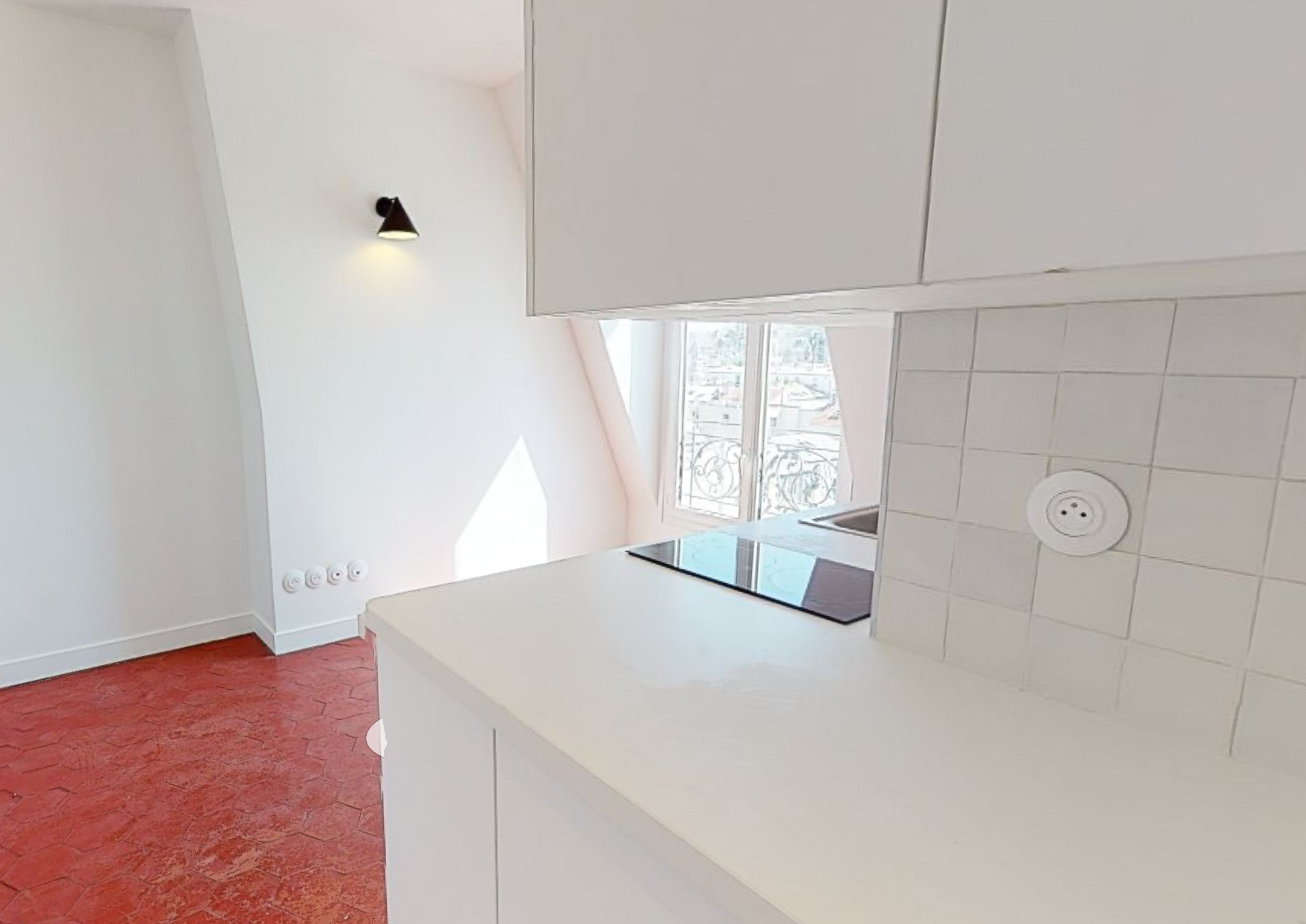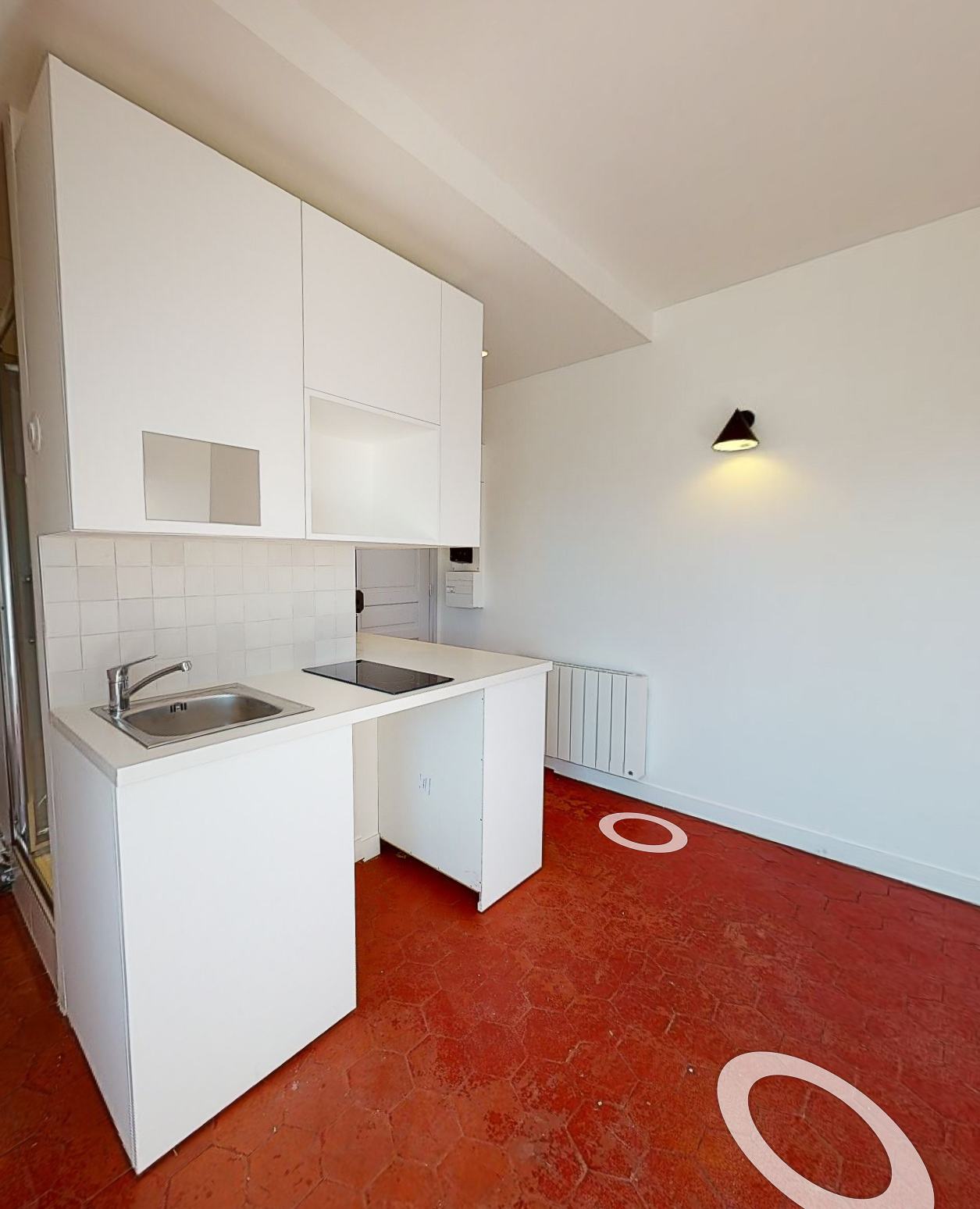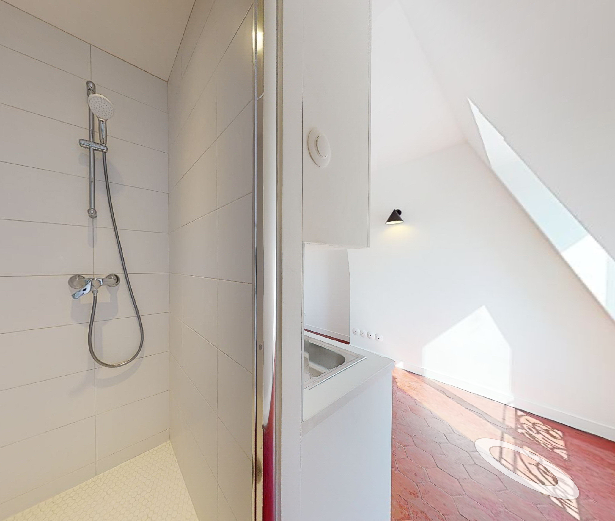 Création d’une douche et d’une cuisine. Conservation de la tomette au sol.
