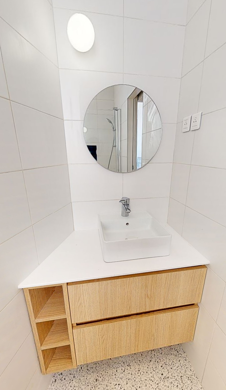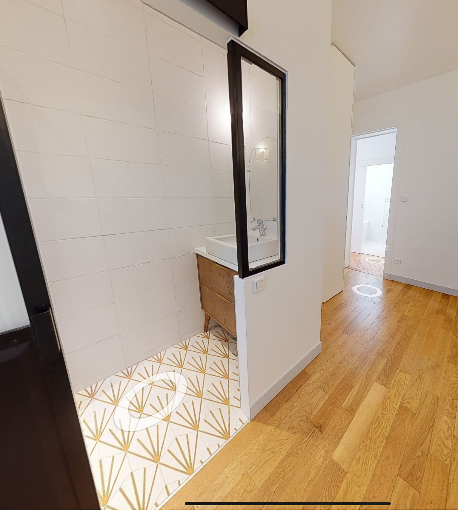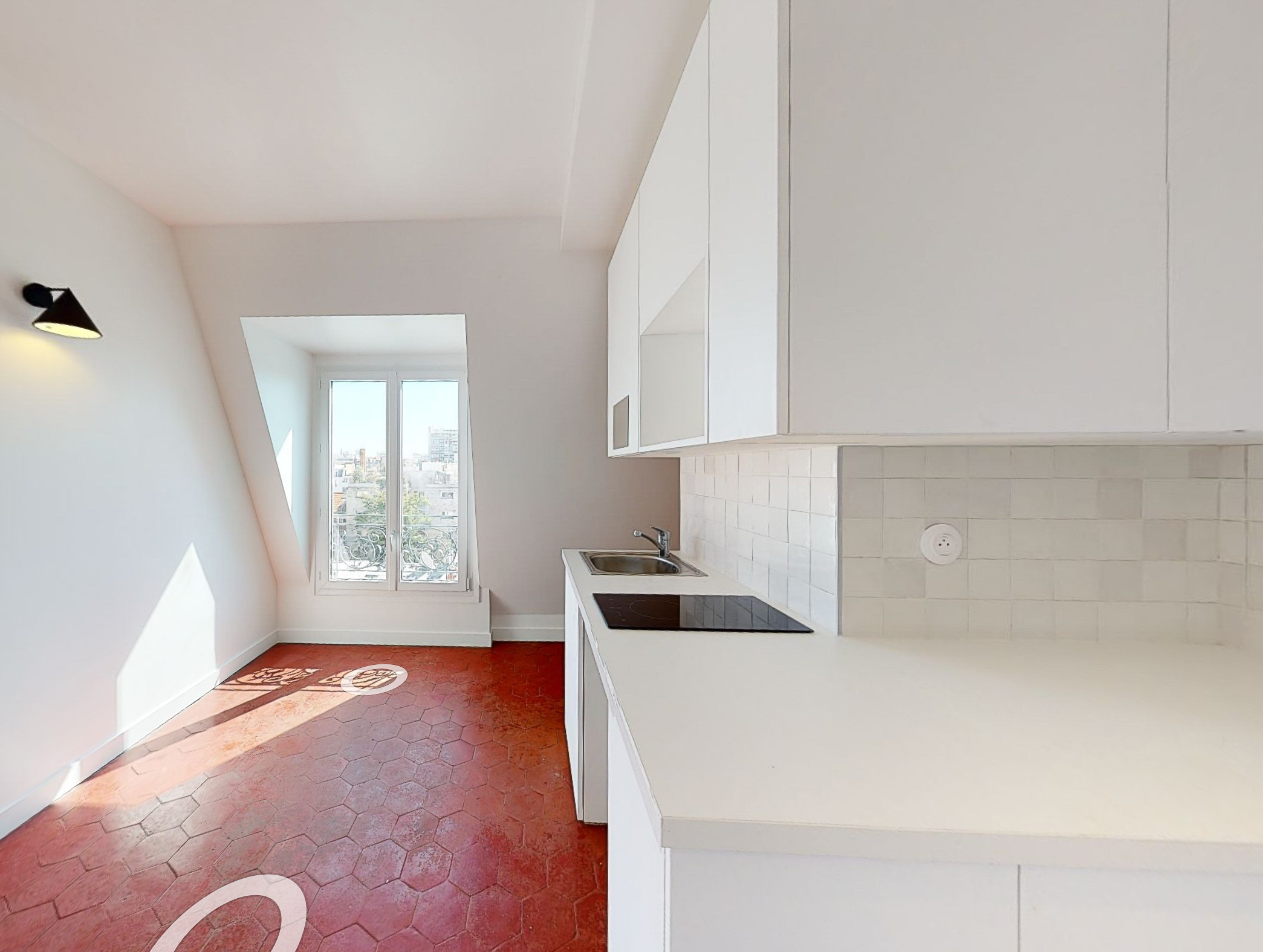 Création d’une douche et d’une cuisine. Conservation de la tomette au sol.